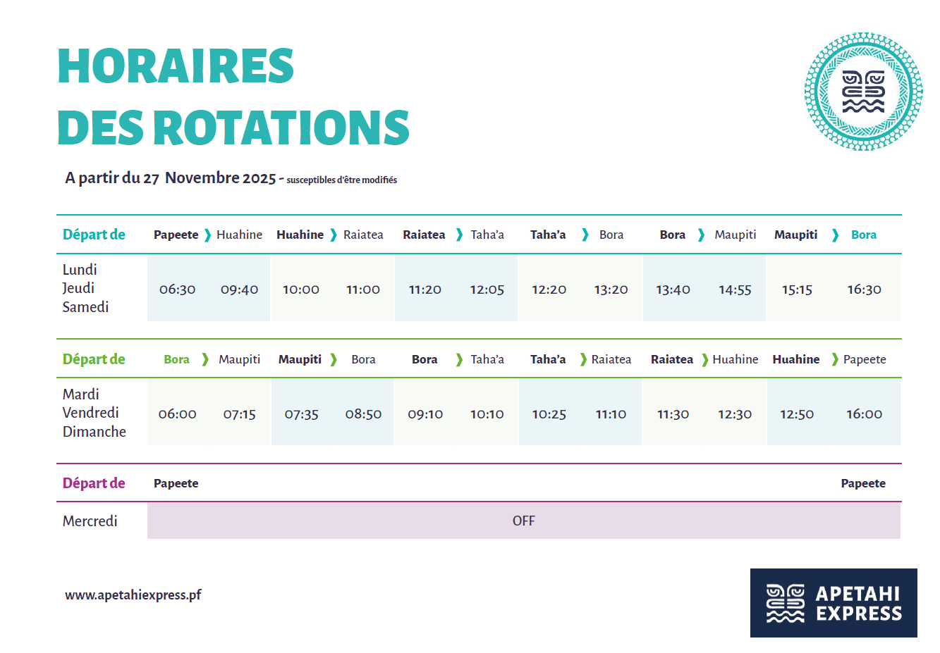 L’Apetahi Express est une navette régulière. Elle relie Tahiti et Huahine en 3h00‚ Huahine et Raiatea en 1h00‚ Raiatea et Taha’a en 45 minutes‚ Taha’a et Bora en 1h00 et Bora et Maupiti en 1h00. 30 minutes d’escale sont prévues sur chaque île.